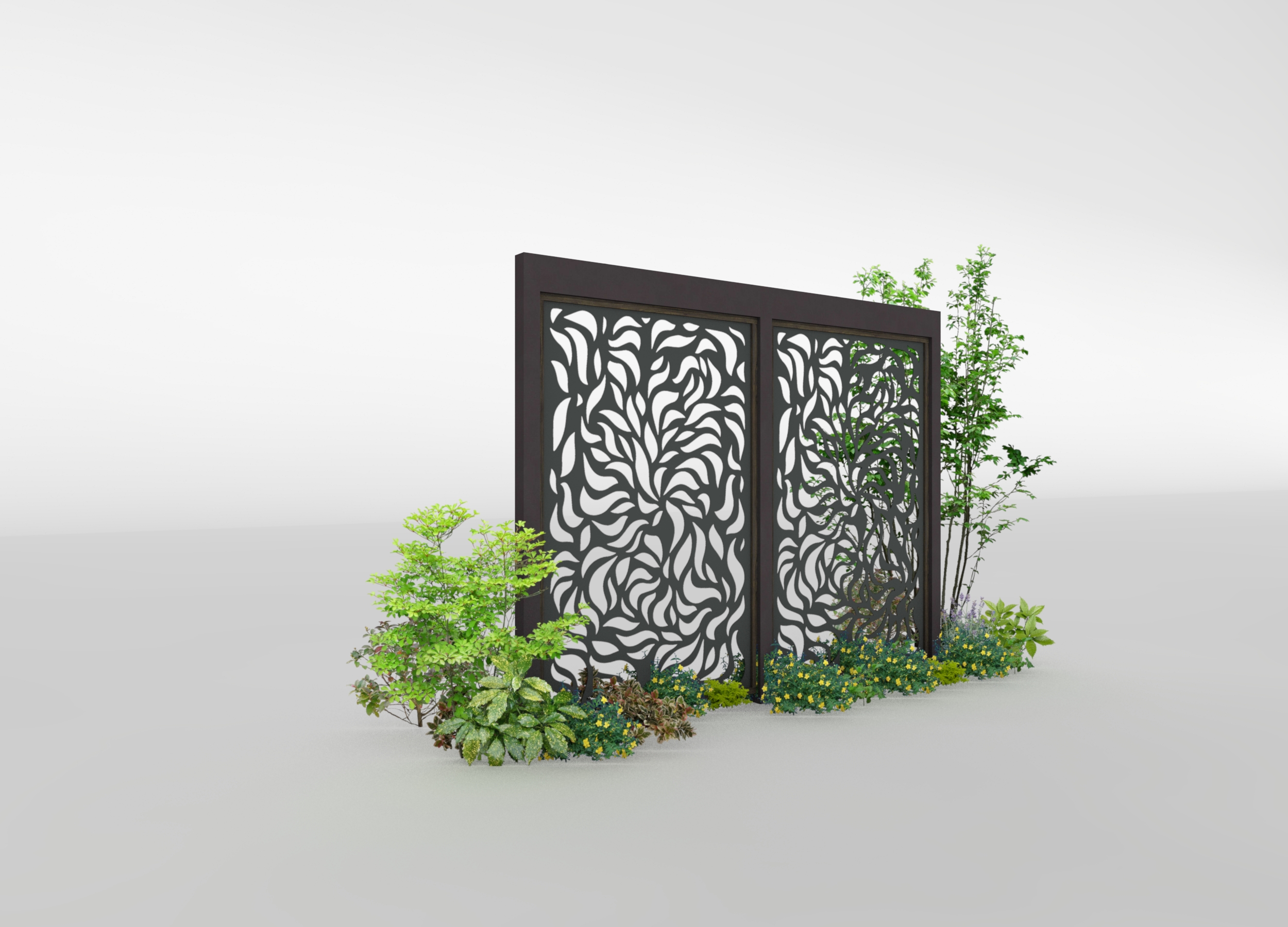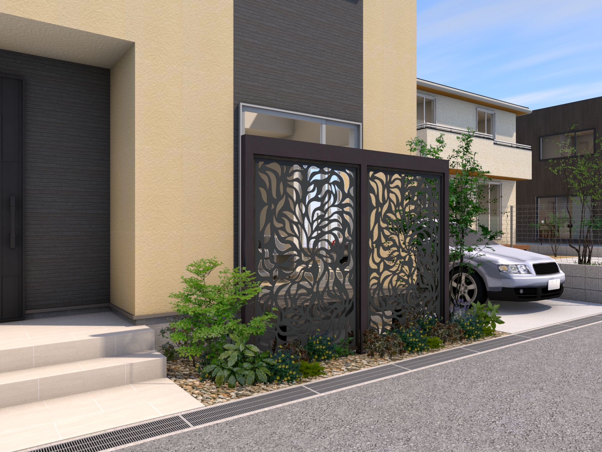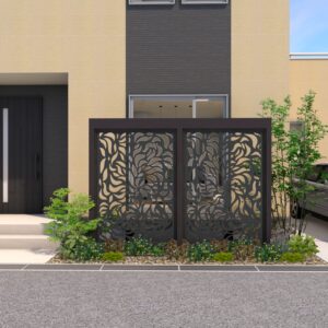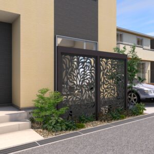 透け感のあるデザインパネルとエバースクリーンフレームを組み合わせたプランです。 京町家かきちゃのフレームに、ブラックのパネルを合わせ、ファサードを落ち着いたスタイルに演出します。 データのダウンロードはこちら ▼
