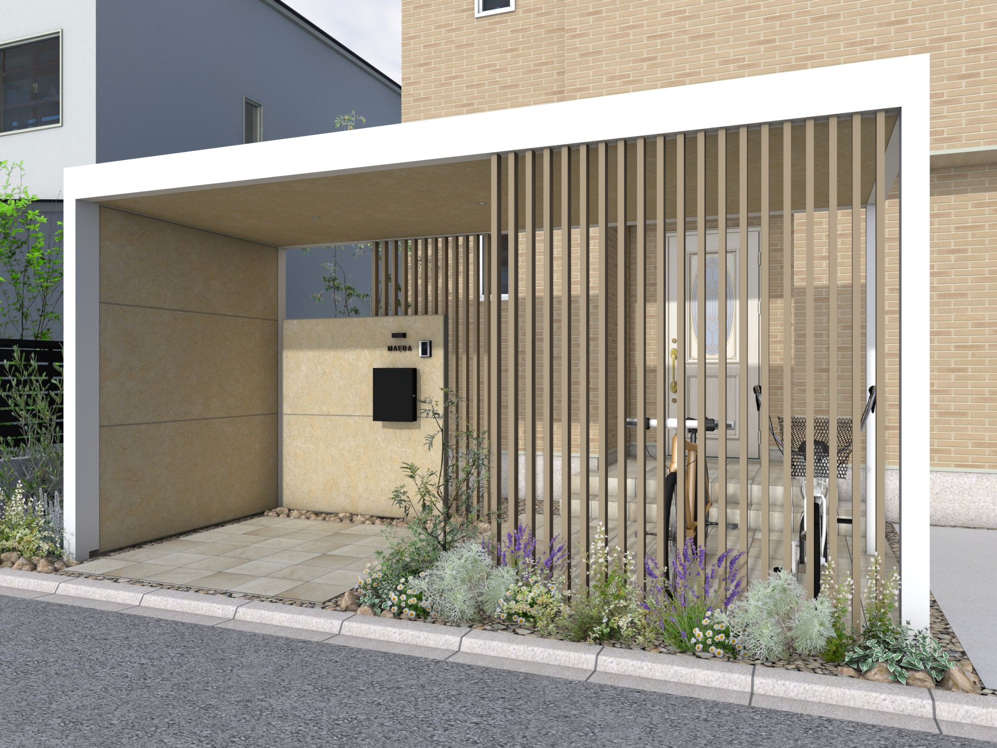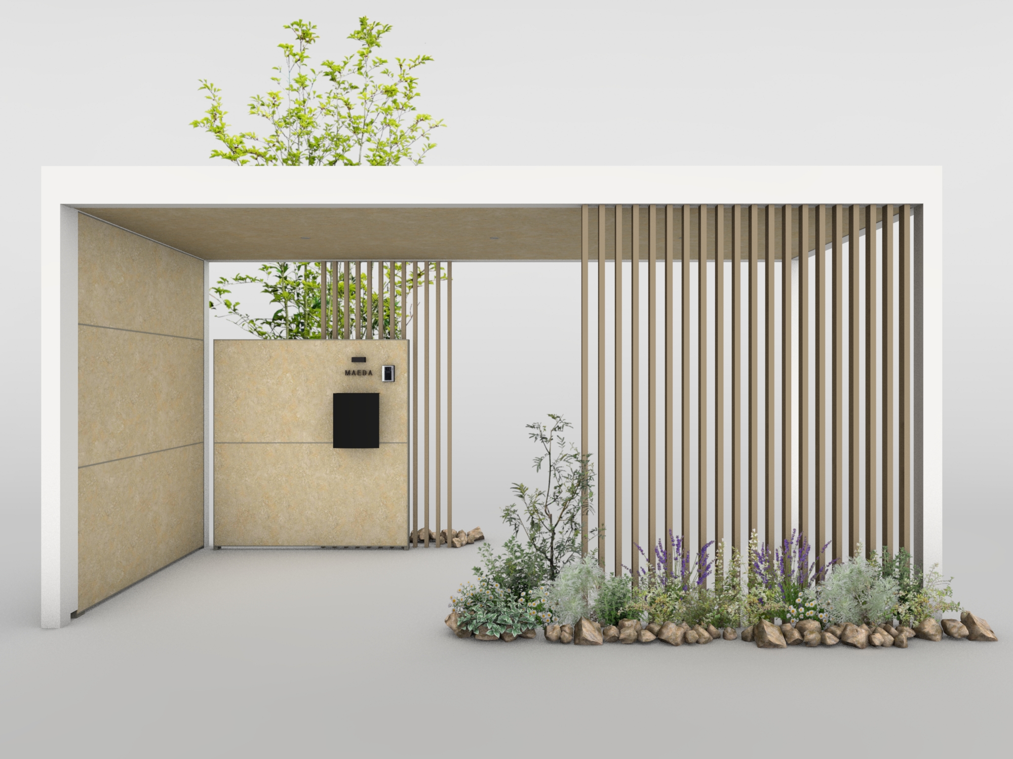 ホームヤードルーフの門周りの中に、駐輪スペースの機能を持たせました。玄関の目隠しも兼ねたスクリーンと重なるように、スクリーンの手前にも植栽を配置することで自転車の存在感を和らげ、空間の中に溶け込んで見えるようにしました。豊富なカラーバリエーションで住まいに合わせてのカスタマイズが可能なパッケージデザインです。