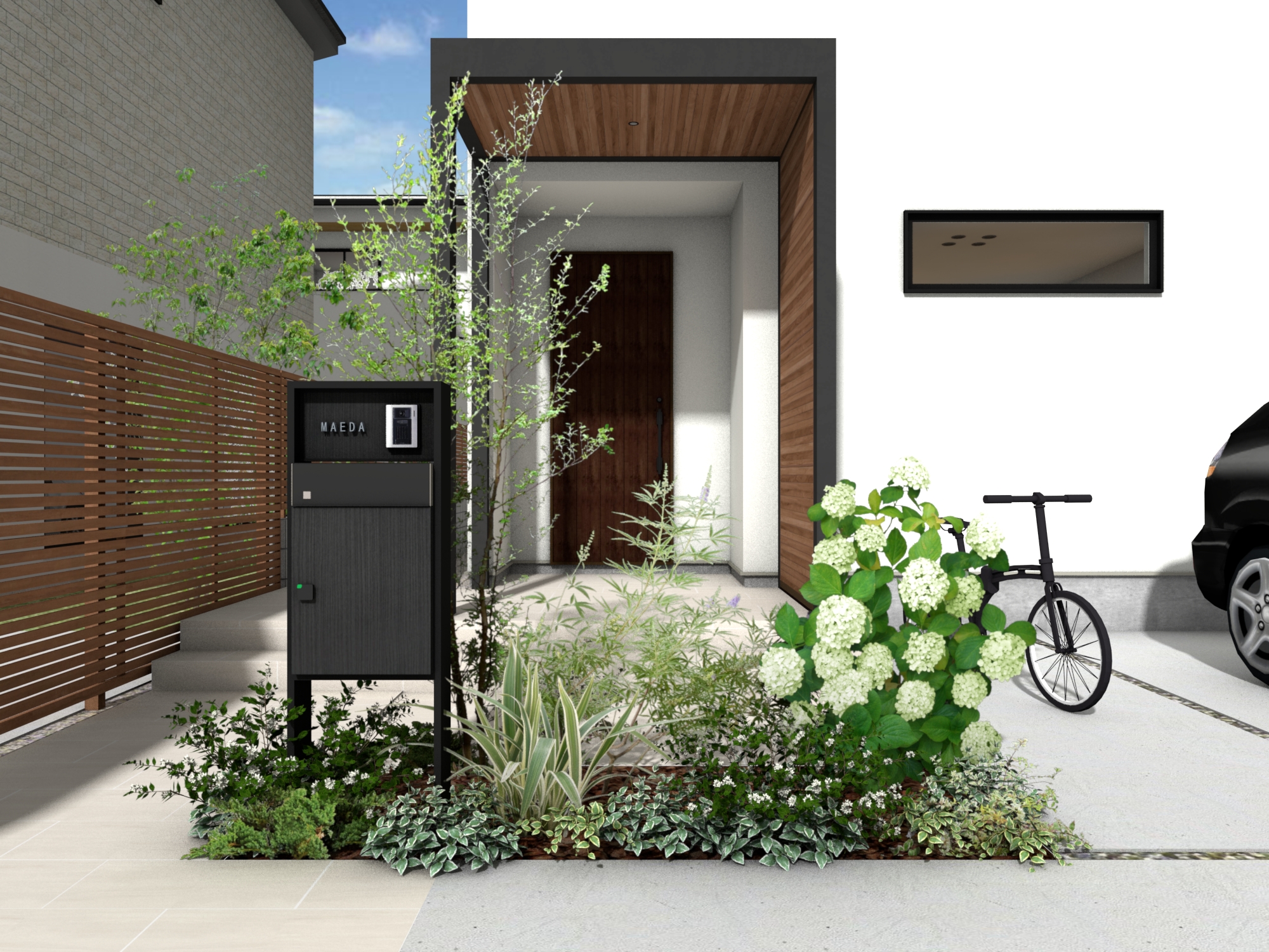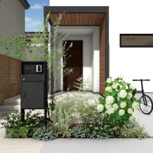 シンプルな門柱(例えばDe-Plus門柱)と色を合わせることで、洗練された玄関まわりになります。