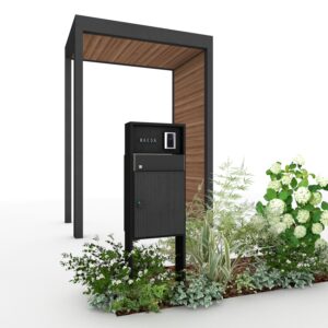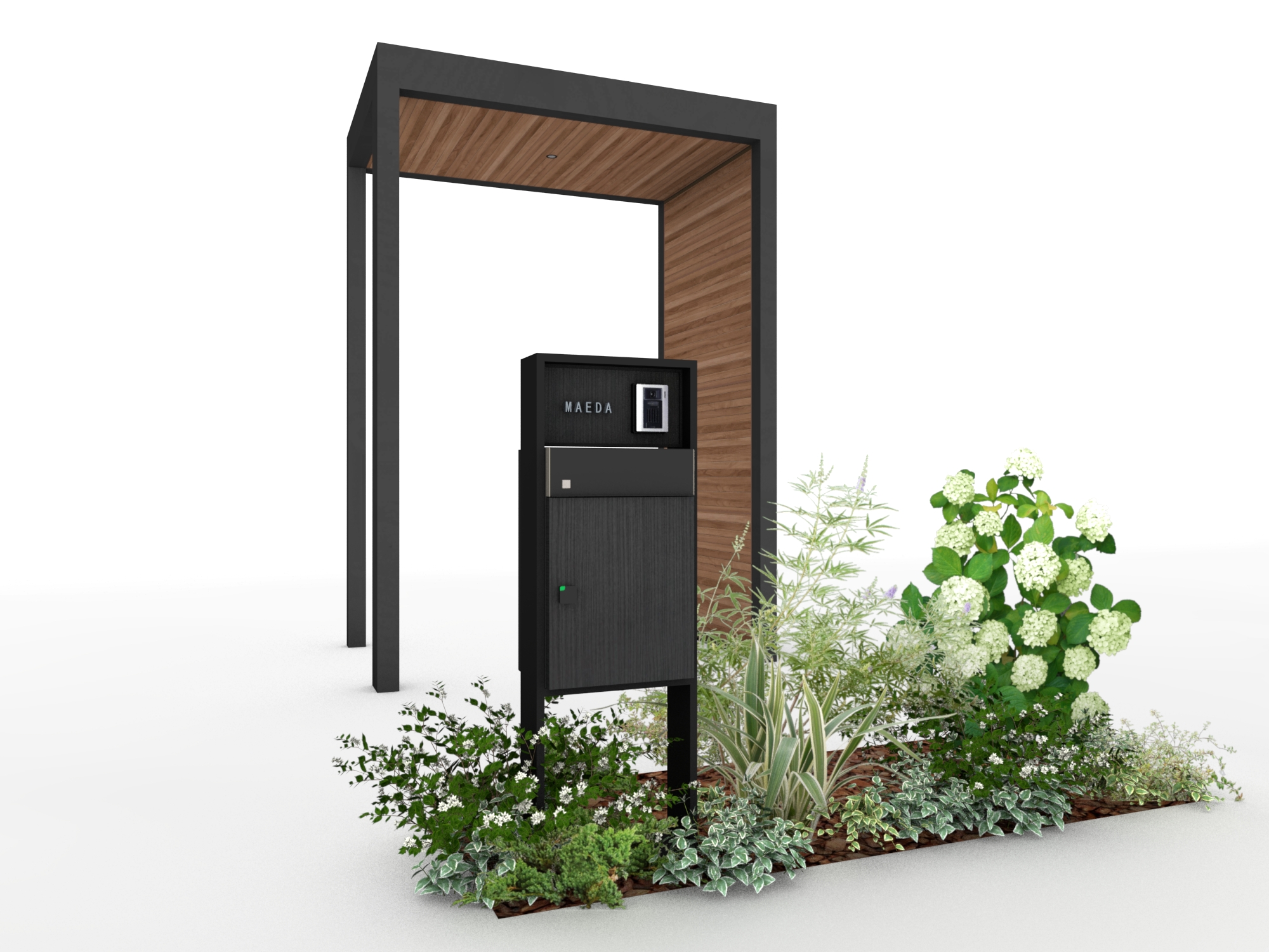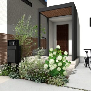 玄関先にホームヤードルーフⅡを取り付けるプランです。 片面を壁面にすることで、例えば西日をカットしたり、風雨避けになったり、プライバシーを確保することも可能です。 シンプルな門柱(例えばDe-Plus門柱)と色を合わせることで、洗練された玄関まわりになります。