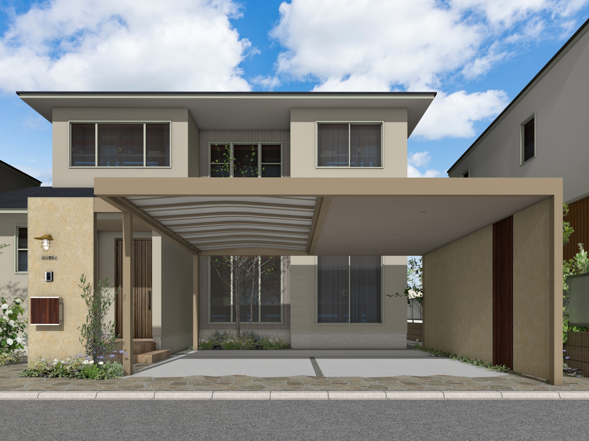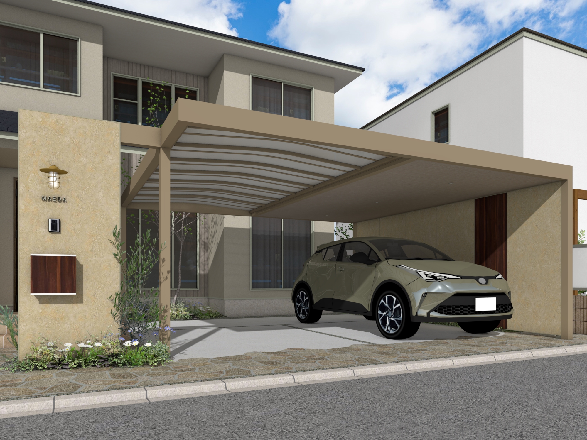 ホームヤードルーフカーヤードとフレーム門柱が一体化した車庫まわりです。建物躯体側は屋根材ポリカーボネートで玄関周りや室内へ採光を捉え、片面は内天井から壁面とエバーアートボードで囲みデザインしました。囲まれることで室内を感じられる空間になり、車を守るだけでなく、アウトドアスペースなど、幅広い利用が可能になります。マットベージュのフレームにエバーアートボードの石柄と木柄の温かみのあるアースカラーで、植栽がなじむ魅力的なファサード空間です。
