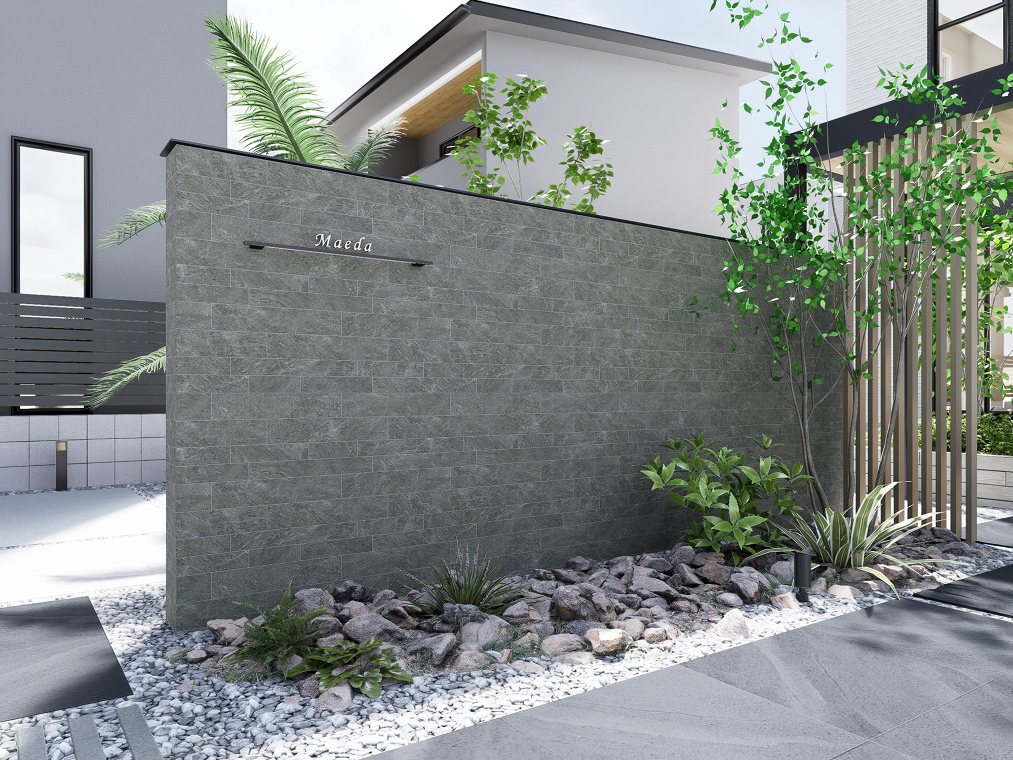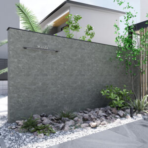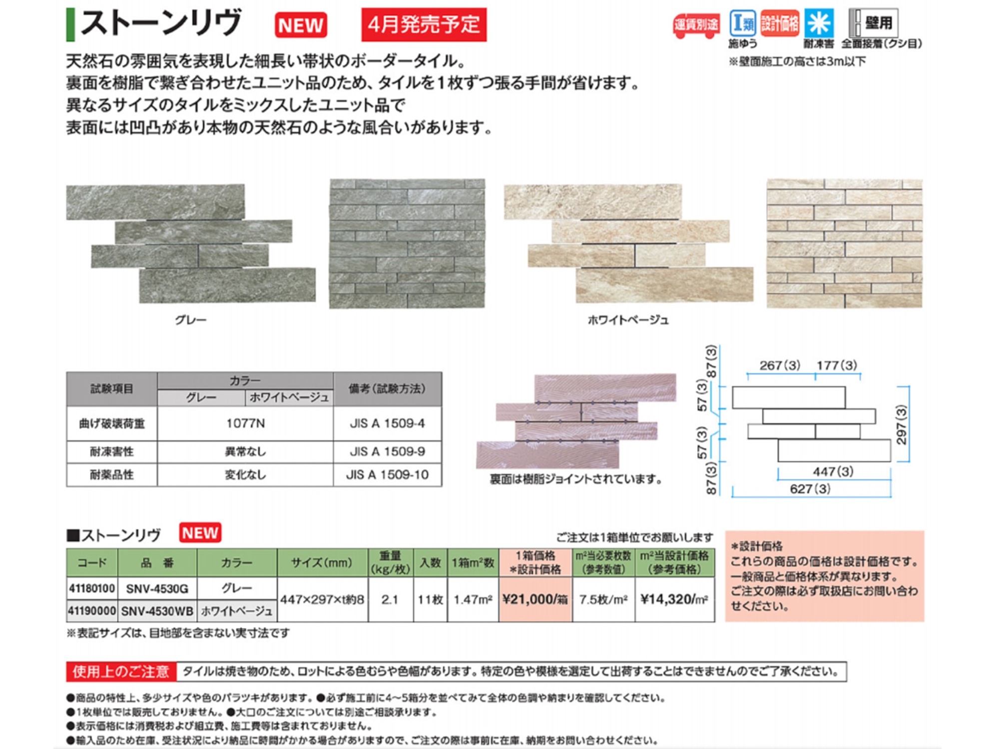 天然石の雰囲気を表現した細長い帯状のボーダータイル。裏面を樹脂で繋ぎ合わせたユニット品のため、タイルを1枚ずつ貼る手間が省けます。異なるサイズのタイルをミックスしたユニット品で表面には凹凸があり本物の天然石のような風合いがあります。