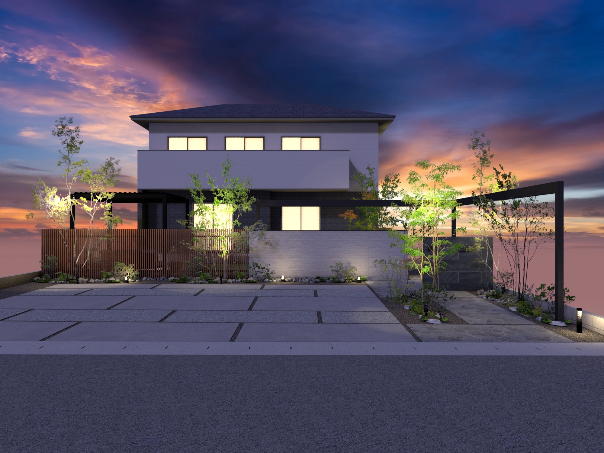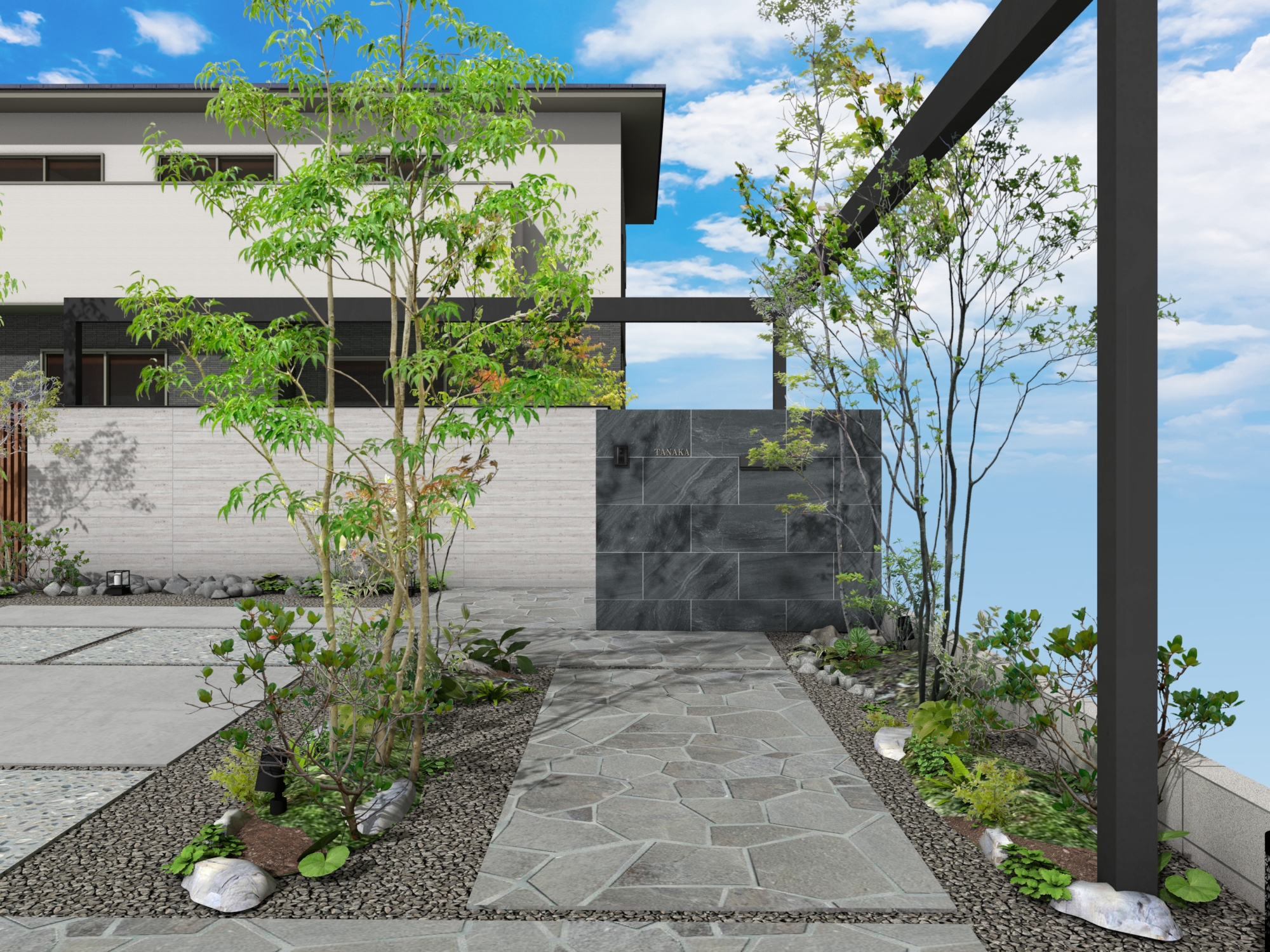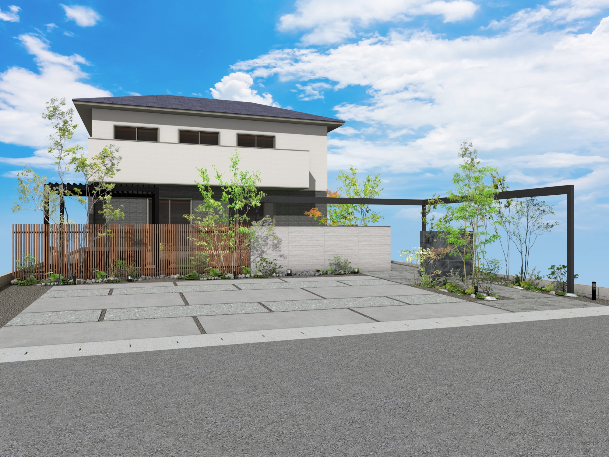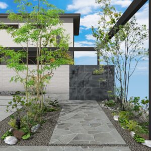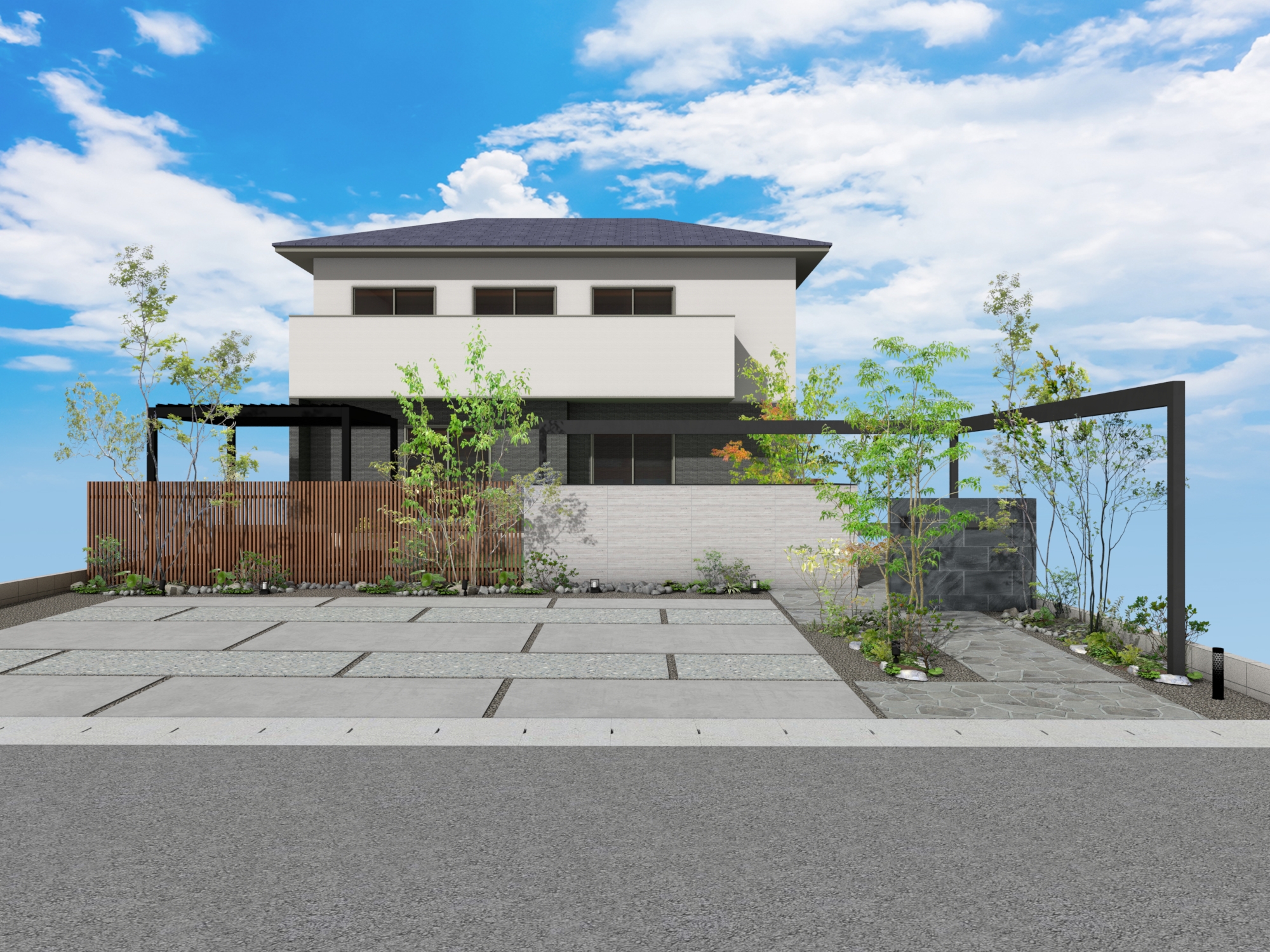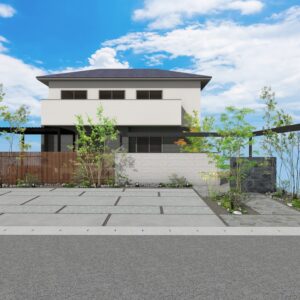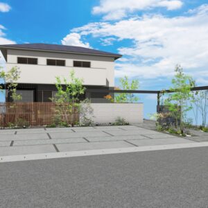 タイル塀と格子を組み合わせて視線をスマートに遮りながらも空間にリズムを生み出します。L字に設置されたフレームがシャープなラインを描き、建築全体に洗練された輪郭をプラス。プライバシーを守りながらも、開放感とデザイン性を両立した目隠しファサードプラン。 データのダウンロードはこちら ▼ ※トータルファサードプランに3Dデータはございません。