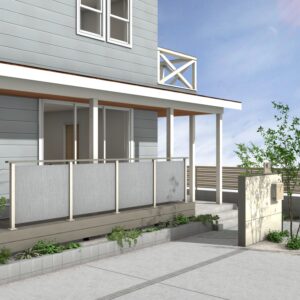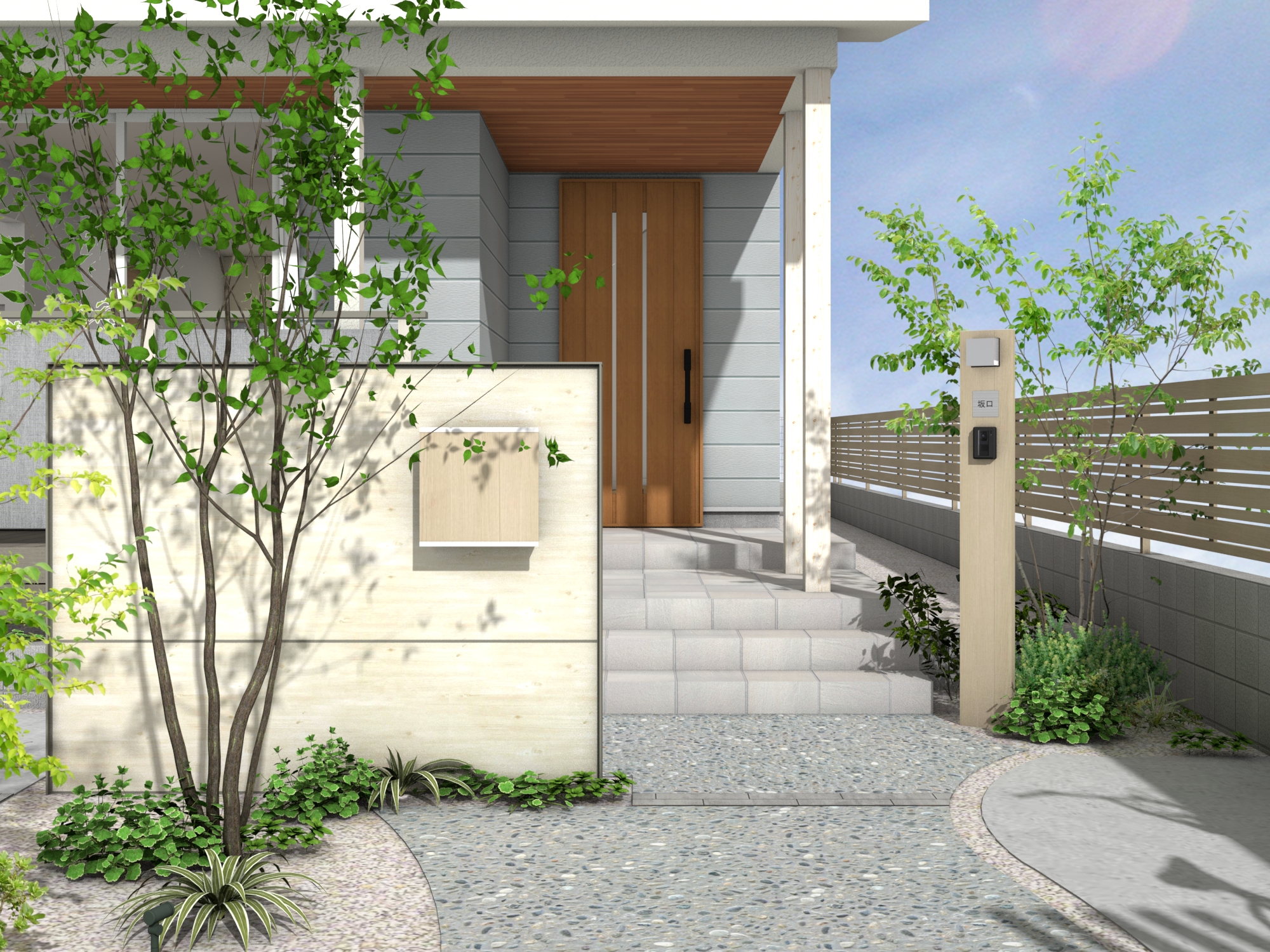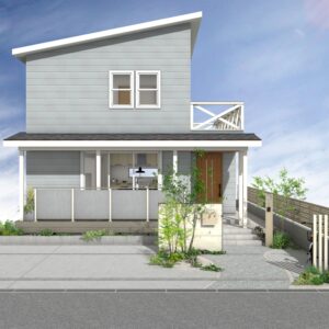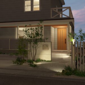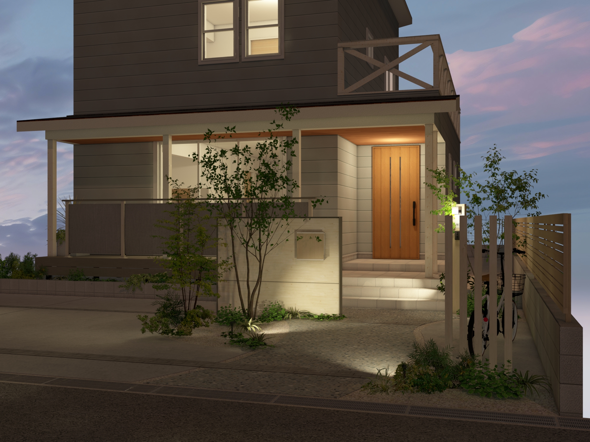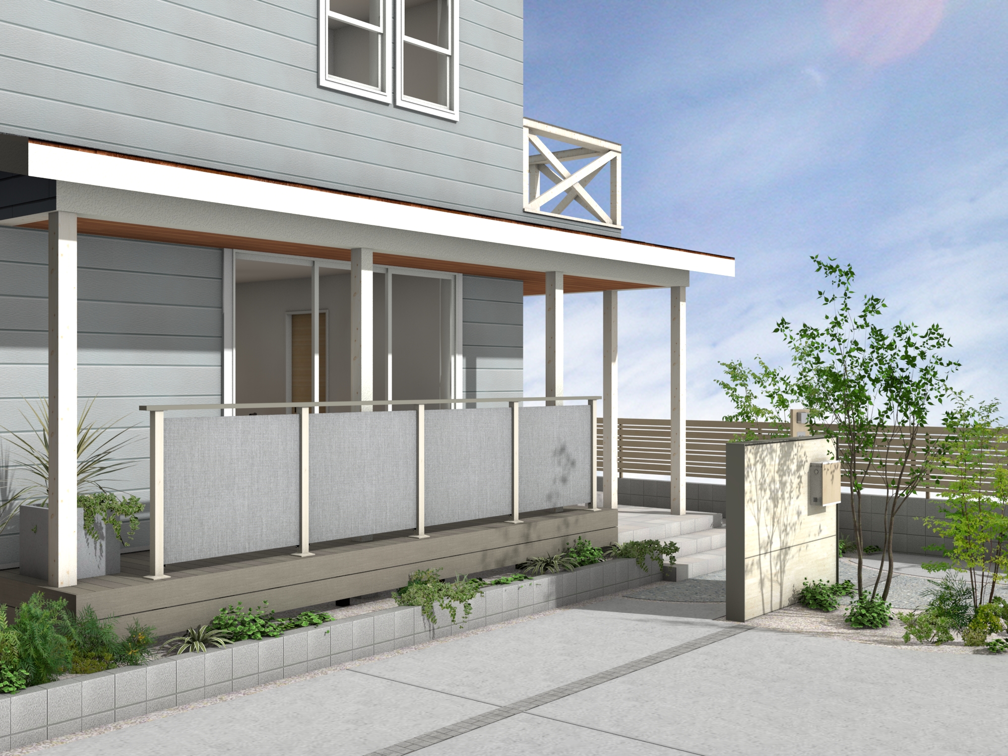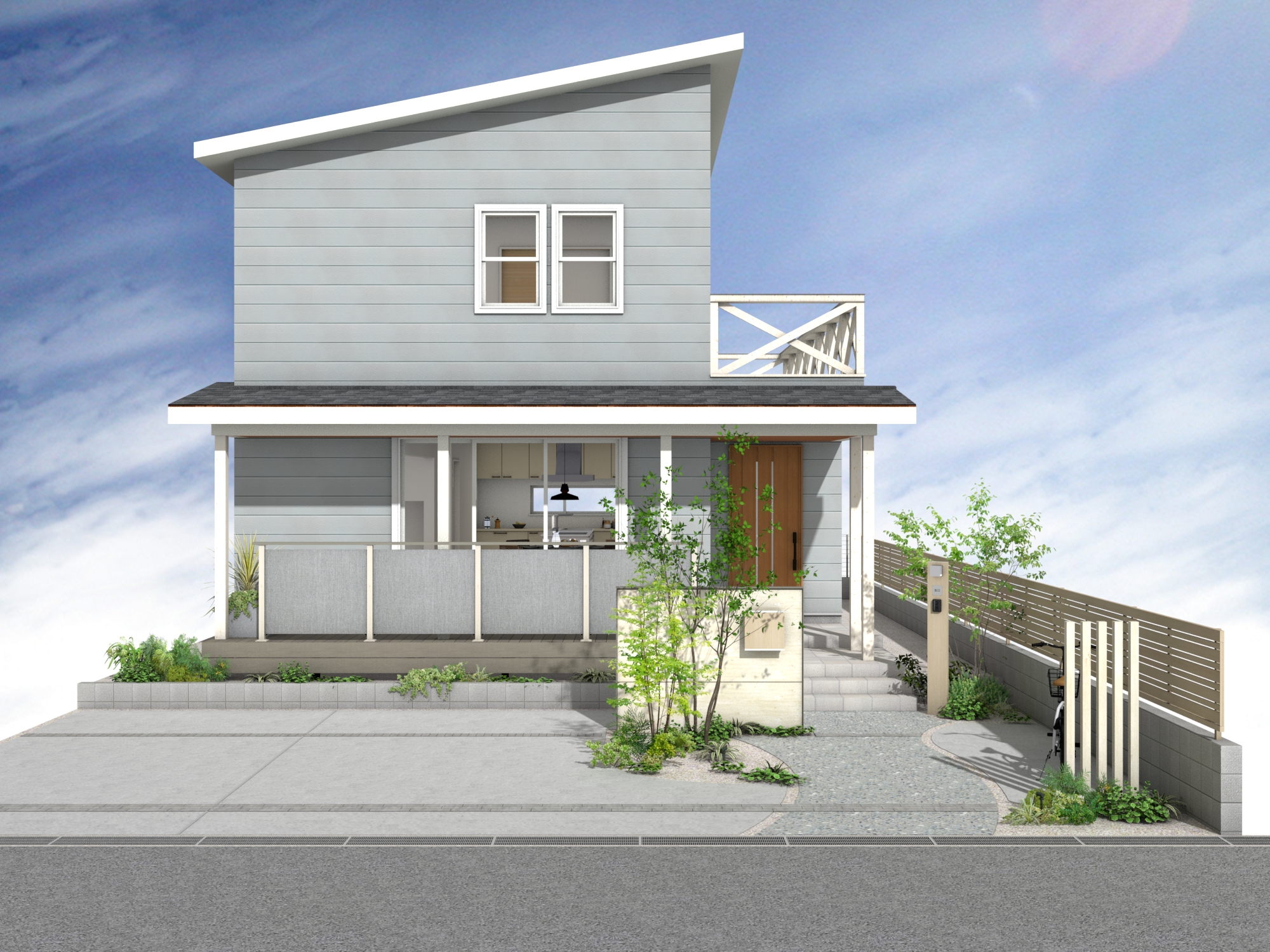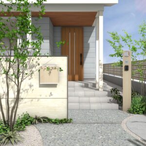空へと開かれた片流れ屋根のモダンな住まいに調和する外構プランです。リビングから繋がるウッドデッキは、テキスタイルフェンスによる適度な目隠しでプライバシーを守りつつ、光と風を感じる開放的な中間領域を創出します。雑木と洗い出し舗装で彩られたアプローチが、建物に自然の潤いを添え、住まいと街並みを心地よく繋ぎます。 データのダウンロードはこちら ▼ ※トータルファサードプランに3Dデータはございません。