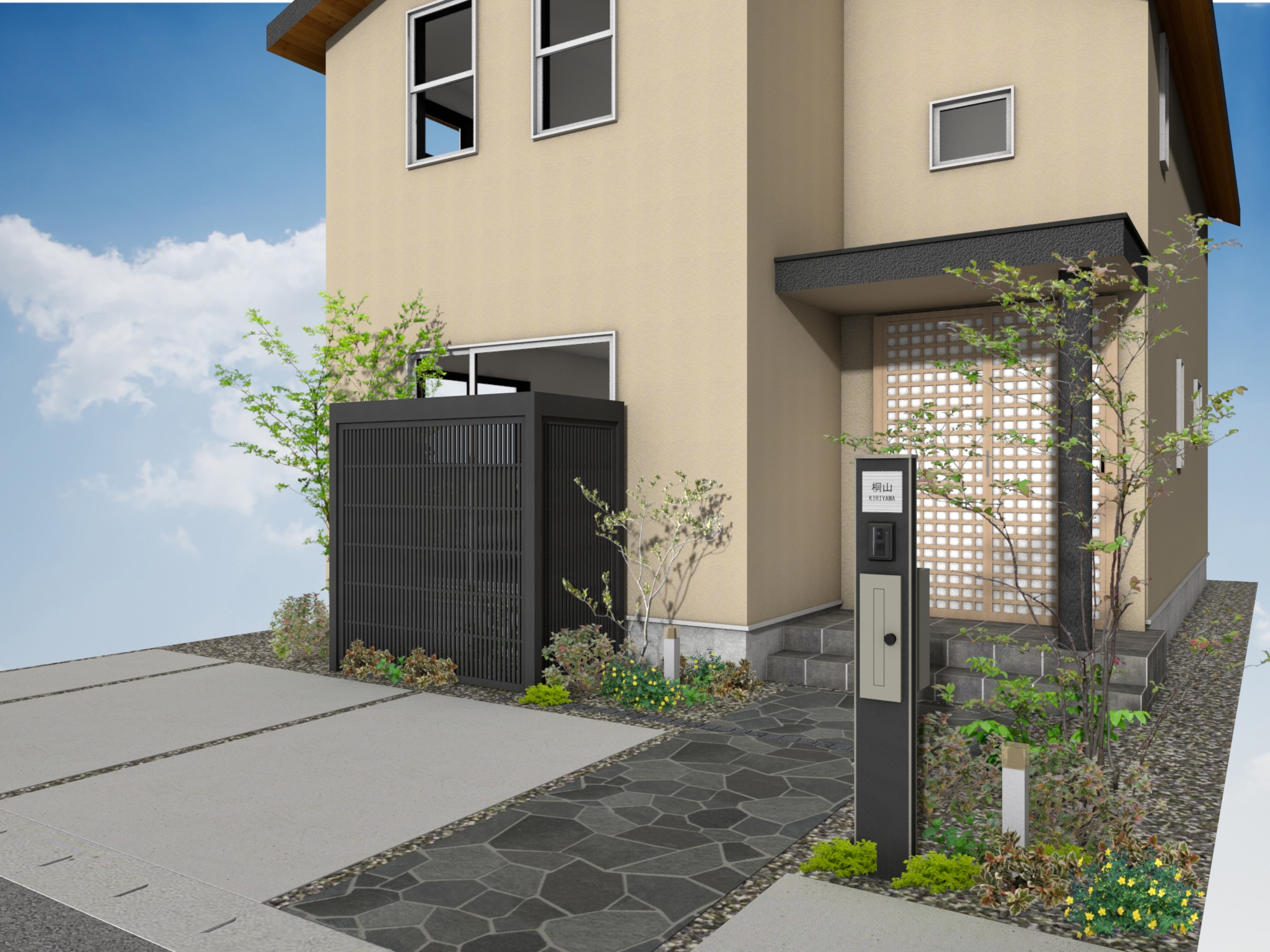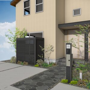 エバースクリーン縦細格子の目かくしが、やわらかな光と影のコントラストで温かみを演出し、L字に囲うことで坪庭を楽しむこともできます。シンプルな機能門柱とライトは、家族や来客を優しく迎え、心地よい時間が流れる、安心感あふれる外構空間をつくります。